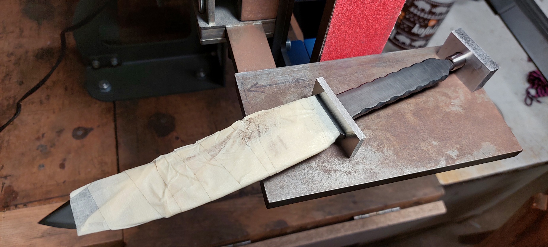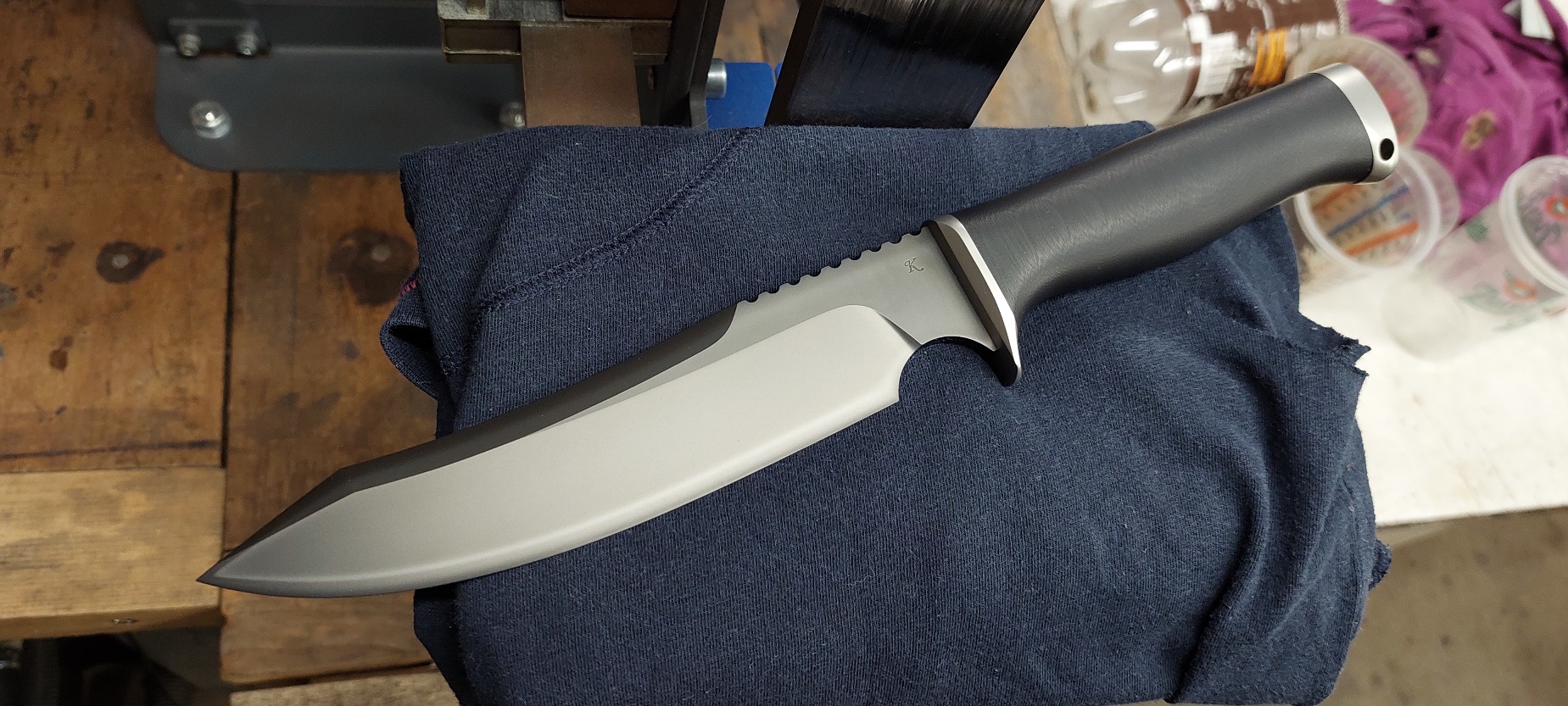 I do not make my knives by smithing, but by grinding a plate of steel. After grinding the shape of a knife (blade), the flat grind is done. After the required surface finish, the blade travels through a vacuum furnace to be heat treated. Next step is fitting a handle, which part could be also a guard and a pommel in some types of knives. For my knives I make leather or Kydex sheaths for ease of carrying.